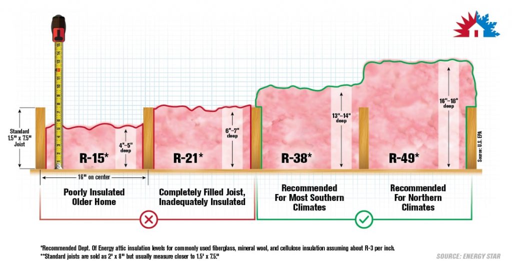 Insulation is rated in terms of thermal resistance, known as R-Value. The higher the R-Value, the better the insulating power. The amount of insulation recommended for your home is largely dependent on where you live, but as a general guideline, homes in a cold climate should have a minimum of R-49 in the attic and warmer climates only require an R-38. Here are the three main types of attic insulation available: